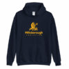 Gildan Heavy Blend Hooded Sweatshirt. Hoodie color is navy. Printed with a yellow HCA logo on front of hoodie.