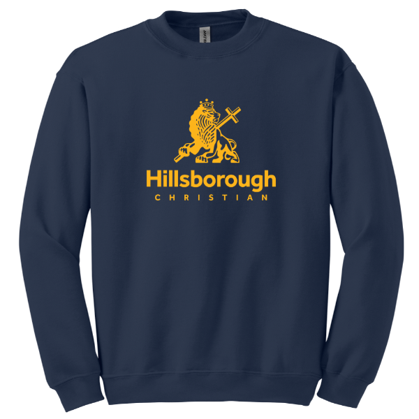 Gildan Heavy Blend Crewneck Sweatshirt. Sweatshirt color is navy. Printed with a yellow HCA logo on front of sweatshirt.
