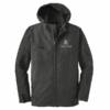 Port Authority Textured Hooded Soft Shell Jacket. Jacket color is charcoal grey. Embroidered on front with a white HCA logo on right chest.